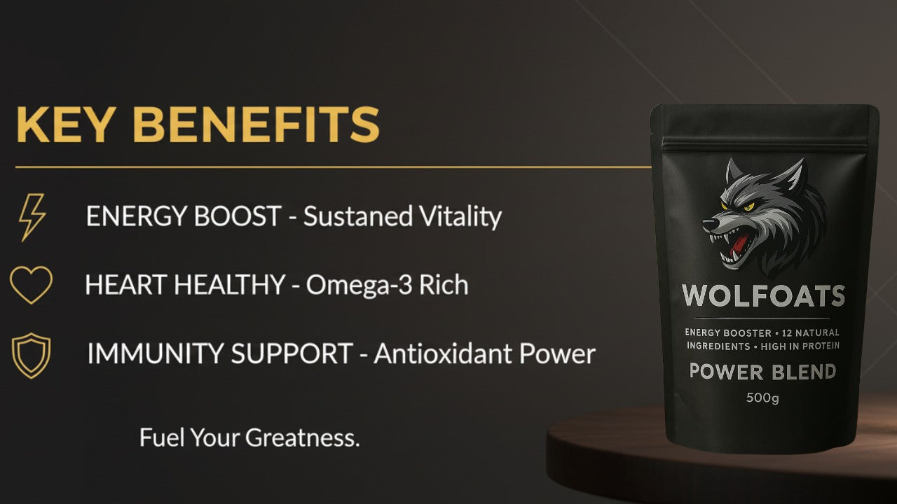 WOLFOATS Power Blend is a natural energy booster made with 12 premium ingredients to increase stamina, strength, and performance. It provides clean and long-lasting energy without artificial boosters, helping the body stay active during workouts, sports, and daily routine. High protein support makes it ideal for muscle building and fast recovery, giving you real power throughout the day.